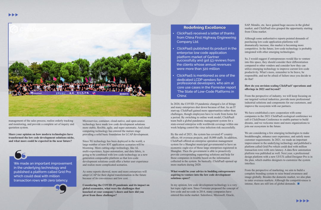 2022年年初,pg电子入选外媒Insights Success低代码/无代码开发平台 Top10,创始人、CEO胡柏受邀接受专访并荣登封面人物,他与Insights Success的读者分享了pg电子成立的初心、发展历程、当前的行业发展趋势以及他对公司未来的展望。